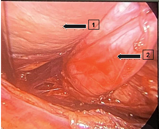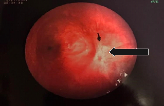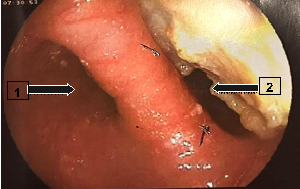Figure 1 Upper digestive endoscopy findings. Arrow (1) Esophageal lumen, Arrow (2) epiphrenic diverticulum in the esophageal lumen.