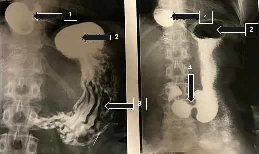 Manometric examination within normal standards. pH-metry, a test that captures any reflux episodes, assesses the pH, intensity, duration and time of occurrence, generating a Meester constant that is above 14.72, indicating GERD. In this test, the patient scored 85.2 on the Meester table, and was diagnosed with orthostatic predominant mixed reflux. In the abdominal ultrasound requested after the first consultation, no alterations were found, as well as in the chest X-ray performed after 2 months. An X-ray of the esophagus, stomach and duodenum (Figure 2), taken the following month after the first consultation, showed the presence of a bulky distal para esophageal diverticulum with debris inside and constant diverticulum esophageal reflux. The stomach and duodenum emptied normally, with no signs of organic damage. After analysing the tests, the patient returned to the office to discuss her diagnosis and treatment. With regard to the treatment of this pathology, surgical treatment is not only indicated due to the presence of the diverticulum, it must be weighed up against the potential risks and benefits of surgery, taking into account the severity of the patient's symptoms and the complications associated with the disease.9 Surgical treatment, when indicated, should focus on motor dysfunction and resection of the diverticulum. The approach should be laparotomy, a less invasive technique with lower morbidity compared to thoracotomy. In addition, a myotomy should be performed to reduce esophageal motor disorders and a partial fundoplication in order to avoid esophageal reflux disease.4