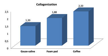 In Table 5, and Figure 3, the rate of wound healing in Group-1 was 5.77±0.44; Group-2 was 6.55±0.88, and Group-3 was 7.22±1.20 (p=0.012). Table 4 showed the difference between the two groups, and the coffee group was the less adhered cell. Degree collagenization (Table 6, Figure 4) in Group-1 was 1,33±0,50, Group-2 was 1.78±0.67, and Group-3 was 2.67±0.50 (p=0.001).