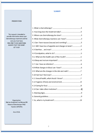 Considering the context of illness of cancer patients, the effects of treatment on the biopsychosocial dimensions and health education, textual construction of the manual was organized having as axis titles as a question. This idea aimed to stimulate the reader (patient/family) to seek the answer in the text, from common questions that occur between patients and family members as can be seen in the summary (Figure 2).