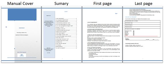 Finally, the guide is composed of 10 pages and one illustration. The manual aims to facilitate the process of orientation that nurses need to perform the first nursing consultation before the start of the outpatient treatment. Figure 3 shows the proposed layout of the cover, abstract, one of the topics and final sheet containing information related to the chemotherapy protocol, contact phone and possible reactions related to specific protocol.