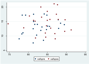 Correlation of the upper airway with the SNA angle.41,42 Low levels of correlation between the upper pharyngeal airway (measured in millimeters (Y-axis)) and SNA angle (measured in degrees (X-axis)) both before (Coefficient: 0.1724) and after treatment (0.00064) were evident (Figure 1). Correlation of the lower pharyngeal airway with the SNB angle. While the correlation between the lower pharyngeal airway with the SNB angle recorded a coefficient of 0.5053 before surgical procedures, which is reduced to 0.3491 after them (Figure 2).43–45