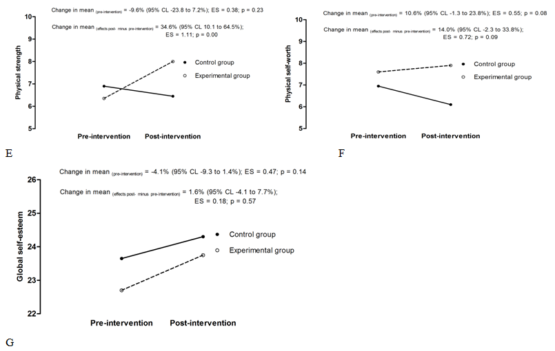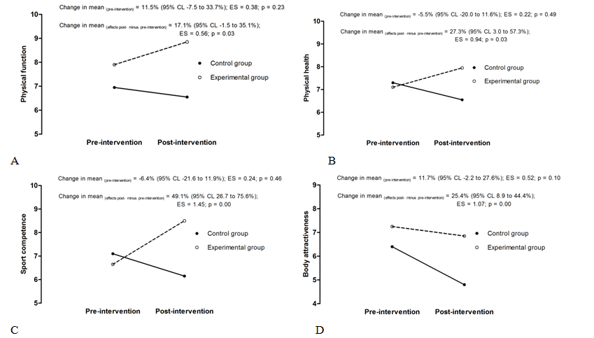 Table 2 shows the effects of the exercise intervention in the experimental group, there were no differences in physical health, physical self-worth and global self-esteem during the 14-week exercise intervention. Noteworthy, the trend of changes for physical health and global self-esteem as consequence of the exercise intervention seems to be possibly, reflected by the small overlap of the 95% confidence limits. Potentially beneficial changes within the experimental group as consequence of the exercise intervention, were apparent in physical function (11.4%, p<0.05, possibly beneficial), physical strength (25.9%, p<0.01, possibly beneficial) and sport competence (28.1%, p<0.01, likely beneficial). Significant changes were apparent for body attractiveness, but the small magnitude of the effect size indicates that differences within the experimental group pre-and post-intervention were possibly trivial. The potentially beneficial trends observed within the experimental group seem to be confirmed when individual responses were compared with the control group (Figure 1). Figure 1 summarized the comparison between experimental and control group at pre-intervention, as well as the comparison of pre- and post-intervention changes between groups.