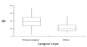 Mann-Whitney comparative test was used to nominal correlations, with statistically significant result only for caregivers’ type (bilateral p=.009), evidencing that family primary caregivers suffer more than the other types (graph 1). Caregivers’ sex evidenced only a trend (bilateral p=.1065) that females suffer more than males (graph 3). Caregivers’ family relationship did not show any statistical significance (bilateral p=.7452), not detecting spouses’ higher burden than children’s.
