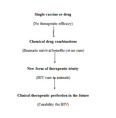 HAART (anti-HIV chemical drug cocktail) is a strategy of combining several antiviral chemicals in the clinic—generally licensed anti-HIV drugs.1–6 In the past, new forms of therapeutic trinity and combination—chemical drugs combined with biotherapies and immune-stimulators are argued for possibly HIV therapeutic curability,6 (Figure 1) However, it needs a series of robust scientific investigation and clinical validity because previous drug combination (HAART) reports and contains some unfavorable side-effects in the clinics (cardiovascular and metabolism).37,38 As a result, therapeutic side-effects need to be reduced as complete as possible.39 More recently, therapeutic cure in animal models has been reported by combining chemical drugs (long acting slow releasing antiviral drug) with biotherapy (genomic editing) in humanized mice.40 This is a piece of exciting news that may interact with past knowledge and therapeutics. Ground-breaking discovery may follow up from similar therapeutic modality and theory.