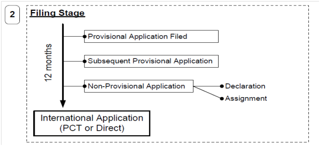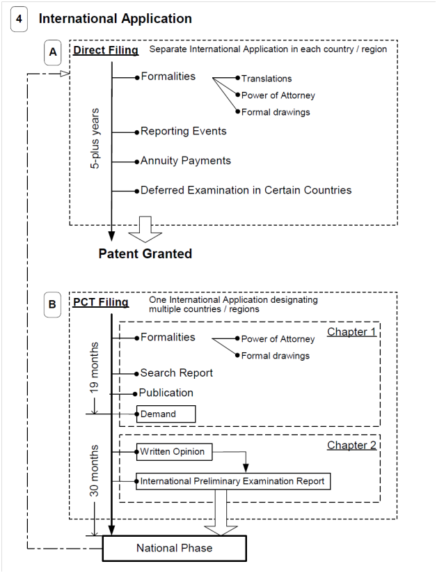 Patent can be filed in two steps: 1. Direct Filling: It grants patent in a single country .i.e. a patent application filed directly in an international country. This application will be examined in accordance with the particular international country’s patent laws and procedures. Examination and approval of a direct-filed application leads to a grant of an international patent in the respective country (Figure 2).22