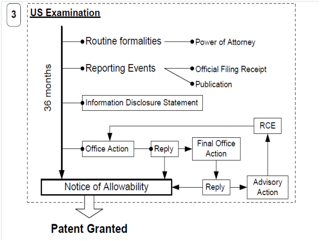 If the examiner determines that your application is in satisfactory condition and meets the requirements, you will receive a Notice of Allowance. The notice of allowance will list the issue fee and also the publication fee that must be paid prior to the Patent being issued. Both approval and examining step come under examination stage.