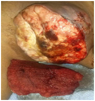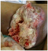 On the following day, we could see how shocking it is to visualize a lesion that causes pain, changes the appearance, has an unpleasant odor, among other characteristics, that brings emotional discomfort even to the health care professional, not to mention those who do not have scientific knowledge like their families and people from their daily lives. It was difficult to clean and remove ointment residues. Pieces of tumor were present on the gauze of the previous dressing, and even with all the care to remove it the patient's report was of intense pain and persistent bleeding. The choice was to use cold saline to clean the wound, and the nursing team was guided not to use any other product. As of this date, we took the responsibility of changing the dressing of this patient, leaving the guidelines for the conduct to be maintained in the medical records. In this context, and considering the difficulty in handling this type of lesion properly, it was necessary to correlate the medical diagnosis with nursing care. Dealing with the dressing made it clear that such coatings were harmful, worsening the appearance and increasing the odor and bleeding. These lesions are commonly rated according to the appearance, odor and staging, as described below based on the palliative care series manual on the treatment and control of tumor wounds and pressure ulcers in advanced cancer, published by INCA.4