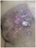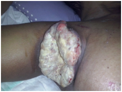 On March 20, 2014, the patient went to the General Emergency of a university hospital located in the city of Rio de Janeiro, Brazil, showing bleeding in a right axillary tumor. She was hospitalized with SEPSIS. Advanced breast cancer, right mastectomy. The patient was admitted with fever, bleeding and pain. Laboratory tests showed leukocytosis (16,000) and hypercalcemia (13.6). At this time, she was already diagnosed with bone and lung metastasis, and was undergoing clinical treatment with neoadjuvant chemotherapy and adjuvant radiotherapy and using oral antibiotic therapy with ciprofloxacin and potassium clavulanate to control the symptoms presented in right axilla ulceration without significant improvement. She was hospitalized with cutaneous sepsis for parenteral antibiotic therapy. Ciprofloxacin and intravenous clindamycin hydrochloride were initiated. On March 24 of the same year, she was transferred to the Surgical Clinic for a possible intervention. During the follow-up of the patient in the hospital ward, it was possible to perceive that the tumor wound had specific characteristics differentiating it from the other wounds, mainly due to its vegetative aspect. The importance of knowing the history of the patient is clear, being it the first step to suspect of a malignant wound, and that it is a cutaneous metastasis. The nursing team of the night shift made a dressing with papain + collagenase. No possibility of palliative surgery.