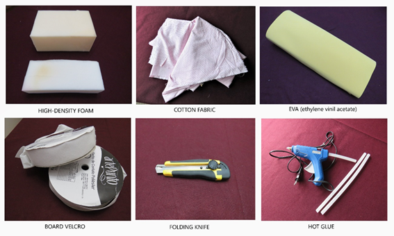 This orthosis is manually made with the following materials: high-density foam, cotton fabric, board velcro, EVA (ethylene vinyl acetate), hot glue, folding or electric knife. The figure 01 shows the materials to be used. For spastic patients, its also used a rigid material placed behind the foam, such as thermoplastic, thin wood board or cardboard (Figure 1).