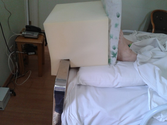 Figure 5 Stroke elderly patient, with no prognosis of functional recovery. This device were made to prevent feet deformities, but with no discomfort for the person. (Photo by author).