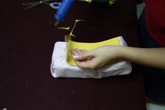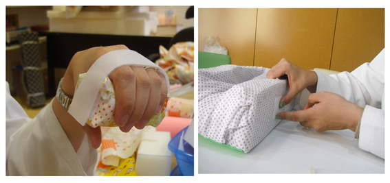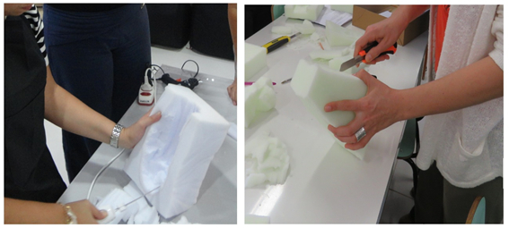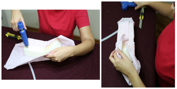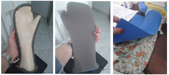 The occupational therapist must assess the patient on an ongoing basis. People with communication difficulties or cognitive deficits deserve special attention, with analysis of discomfort non-verbal signs. All steps to manually made the high density foam orthosis are described below, with corresponding figures. These are just sample steps, for a hand-wrist orthosis; but the high-density foam can be used to any orthosis model. The first step is cut the foam at size needed for that patient's orthosis. The respective body segment is measured in detail by the OT (Figure 7 & 8). The foam must be hollowed out or cut, and the body segment can be accommodated at the orthosis (Figure 9). The OT measures the orthosis again, check how it fits and completes the cut foam. After that, the device is covered with cotton fabric, glued or sewn only on the sides without contact with the patient's skin (Figure 10).