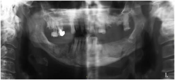 Mrs S.L. was a 51-year-old lady, without significant medical history, when she received in 2009 a diagnosis of breast cancer that was already metastatic at the time (metastases in bones and liver). Because the tumor was strongly expressing hormonal receptors, she was treated with tamoxifen, gosereline and IV zoledronic acid as well as radiotherapy (9Gy) on a painful hip lesion. The patient remained asymptomatic with a normalized CA15-3, until January 2011 when a progression of the breast tumor was observed; the patient declined a mastectomy. At the same time, the liver and bone metastases were progressing and the CA 15-3 was 364U/ml. An ovariectomy was performed and letrozole was started. By the end of 2012, a new progression (liver and bone) was documented; the patient was switched on fulvestrant and denosumab. In June 2014, the patient was still in remission but complained of mandibular pain; denosumab therapy was discontinued (see Stomatology aspects). In May 2015, there was a progression within the breast as well as for the liver and bone metastases. Therapy was changed to exemestane plus everolimus, with a favorable response; this therapy is still continued (May 2016).