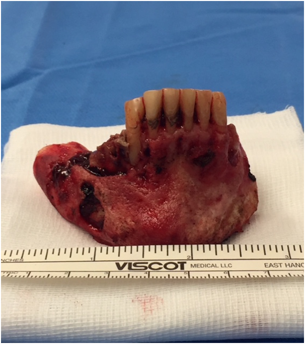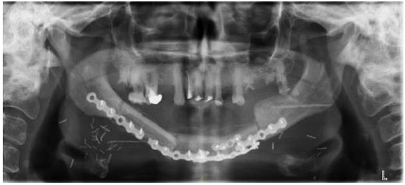 The first oral complaints appeared in June 2014; the patient reported mandibulary pain on the right side. Examination showed an abscess on 44 (right first pre-molar), which was extracted in November 2014. Denosumab was discontinued. Healing was very slow and incomplete. In April 2015, an external fistula with purulent discharge appeared at the inferior portion of the chin; intra-oral examination showed exposed mandibulary bone and loose teeth with an overall bad oral hygiene. Panoramic X-ray showed mandibulary Osteonecrosis involving both sides of the mandibulary symphysis (left 34-35) and right (45-46) with a fracture of the jaw (Figure 1). Therapy with amoxicillin (orally) and H2O2 rinses was started. In July 2015, the situation was unchanged but a large abscess had appeared under the chin; a surgical drainage was undertaken; amoxicillin and H2O2 rinses were continued. In October 2015, the situation was unchanged and the same therapy was continued; at the same time the patient was receiving everolimus, in addition to exemestane and extensive aphtosis was successfully treated with low level laser therapy. Because the stage III mandibulary Osteonecrosis was still progressing with extensive bone necrosis and multiple external fistulae, in spite of continuing therapy with various antibiotics, the decision to perform a wide resection of the lesions was taken in April 2016, following extensive discussion between the patient, the oncologist and the oral surgeon.
