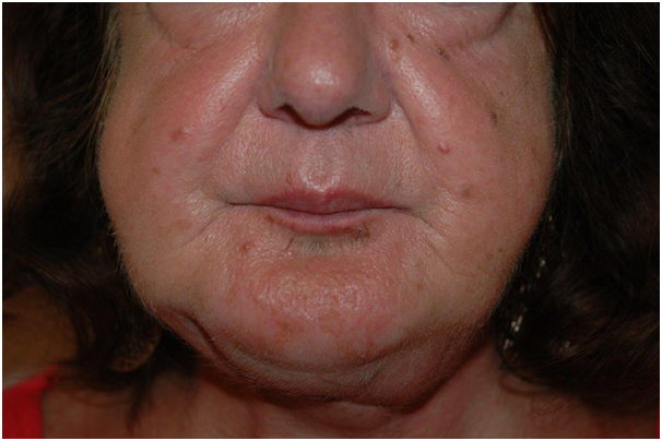 Figure 2 shows the respected portion of the mandibulary bone and Figure 3 shows the reconstructed mandible and Figures 4 & 5 the end cosmetic result. At the present time (9 months after the procedure), the patient’s metastatic disease is still under control with hormone therapy. After a smooth post-operative course, her maxillary bone is healed and she is being prepared to receive dental implants (Figure 4).