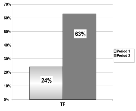 The mean of leukocyte, platelet and hemoglobin concentrations comparing period 1 (OS) and period 2 (TF) did not demonstrate any difference in the TF group.