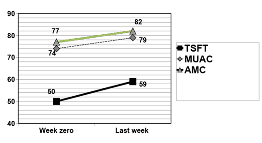 TSFT: week zero: 50 (31–100), last week: 59 (29–114); p=0.001; MUAC: week zero: 74 (58–87), last week: 79 (65–99); p=0.0002; AMC: week zero: 77 (64–90), last week: 82 (67–102); p=0.0004.