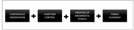 In addition to adequate symptom control and continuous observation, there were developed strategies to restore meaningful activities in the patient's daily life. The rehabilitation team played a key role in recovering his life story. The main procedures undertaken were: evaluation of visual perception, motricity and stimuli response; offering sensorial stimuli (touch, smell, sounds, taste and so ever); organization of activities outside hospital bedroom, such as a tour in the garden; prescription of simple assistive technology devices for bed/wheelchair positioning; development of alternative communication.