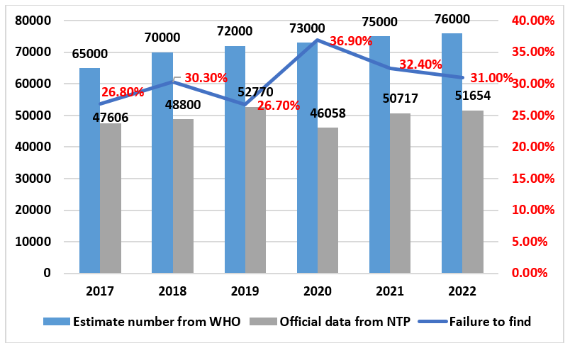 In the Islamic Republic of Afghanistan, the situation of the population with tuberculosis remains a matter of concern. The difference in the rate of finding new cases of tuberculosis between official statistics and the rate of assessment by the World Health Organization (WHO) is shown in Figure 1.