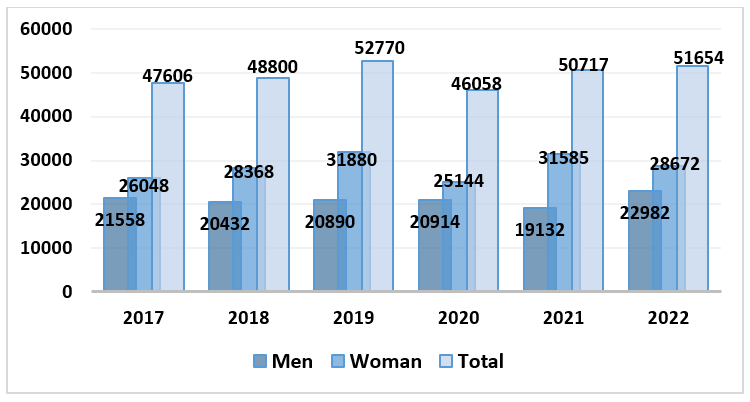 Figure 2 shows the difference in the incidence of tuberculosis between men and women. From this picture, it can be seen that in the last 6 years, women are more prone to tuberculosis than men. The difference in morbidity is equal to 4490 cases in 2017, 7936 - in 2018, 10990 - in 2019, 4230 - in 2020, 12453 - in 2021 and 5690 cases in 2022 and is significant (p<0.001).