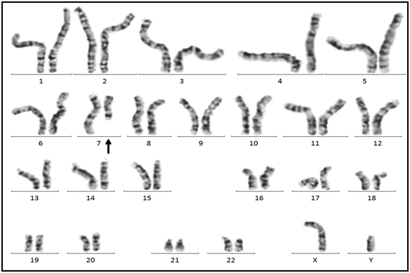 A 57 year old man was referred to our institute with history of fever on and off, generalized weakness and pallor for 06 months. Complete blood counts were done which showed Hb of 6.6 g/dl, WBC count of 2.1x10^9/L with ANC (absolute neutrophils count) of 0.2 x10^3/uL , platelet count of 13x10^9/L with MCV 99 fl, MCH 31 pg MCHC 31, Neut-x 344 and Neut y 732. Review of peripheral smear revealed pancytopenia and dysplastic neutrophils. Bone Marrow Biopsy showed hypercellular marrow exhibiting erythroid hyperplasia and dyserythropoietic features like nuclear cytoplasmic asynchrony, inter cytoplasmic bridging along with dysplastic neutrophils. Blast cells were less than 05% (500 cell differential). Iron grade was 4+. Patient was given Vitamin B12 and folic acid along with PRBCs transfusion. He also received GCSF for 5 days. Deletion 7q was identified in 15 metaphases on bone marrow cytogenetics analysis (Figure 1). His IPSS score at the time of diagnosis was 1.5 (cytopenias=3, Blast cells=<5%). Based on the morphologic and cytogenetic findings, the patient was diagnosed as MDS and subcategorized as Refractory Cytopenia with Multi lineage Dysplasia (RCMD).