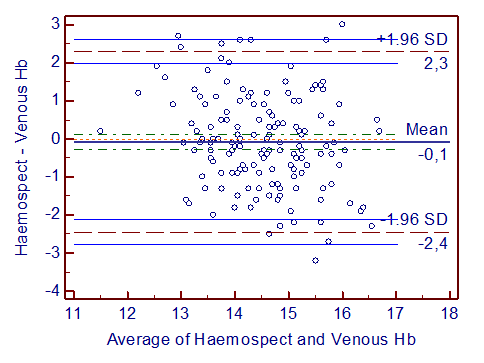 To determine the reproducibility of Hb measurements with each non-invasive method, 30 measurements were made on consecutive days in 3 staff volunteers with known Hb with 15.4, 11.8 and 10.3 g/dl respectively and the coefficient of variation was calculated.