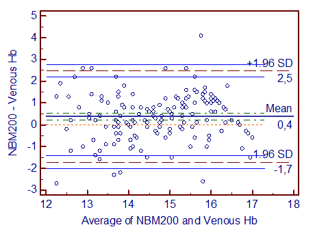 Figures 1-4 show Bland Altman plots and linear regression analysis for the different screening methods and venous Hb measurement with Coulter LH750. Bland Altmant plots represent the bias (solid line) and the 95% limit of agreement (LOA) between the test method and the gold standard method (CBC). The best correlation was obtained with HemoCue, results with NBM 200 and Pronto 7 were similar, and the worst result, although acceptable, was with Haemospect.