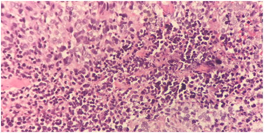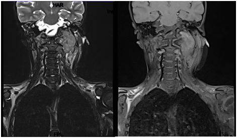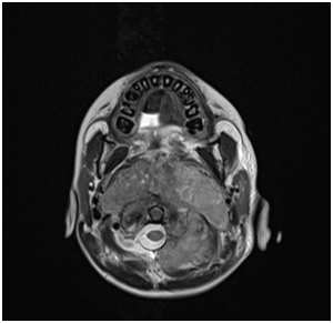 7 years old boy presented with history of left neck mass, headache and weight loss for 1-month duration, with limited range of motion of the neck and increasing pain in that region for 5 days before he was referred to our hospital. Physical examination revealed left upper cervical swelling measuring 5x6 cm in diameter, firm in consistency and attached to the underlying structures, no neurological deficit of signs of respiratory compromise was observed. His initial laboratory results are shown in Table 1. Cervical lymph node biopsy revealed reactive lymph nodes, negative for granulomata and negative for malignancy. Magnetic resonance imaging (MRI) of the neck (Figure 1) showed evidence of perivertebral/retropharynegal large multilobulated soft tissue mass measuring about 7.9x8.7x6.9 cm in transverse, craniocaudal and at the posterior dimensions respectively, extending in the nasopharyngeal region, and extending opposite to the skull base, clivus and upper cervical vertebra body posteriorly with the extension through the neural foramina of C1 and C2 vertebrae and causing bony erosions, extending into the spinal canal, however the signal intensity of the spinal cord was preserved, with narrowing of the right vertebral artery and questionable tumour involvement at the level of C1. Superior extension of the mass is seen obstructing the nasopharynx, anteriorly the mass is seen compressing the nasopharynx and exerting mass effect on the oropharynx with no patent airway seen around endotracheal tube. Infiltration of the hard palate and palatine tonsils were seen, laterally the mass seen compressing the carotid vessels bilaterally with suspicion of marked compression and occlusion of the left jugular vein, however the carotid arteries were patent. The patient underwent incisional biopsy of the retropharyngeal mass and bilateral bone marrow aspiration & biopsy. During surgery patient was electively intubated and due to difficulty in extubating and critical obstructed airway a tracheostomy tube was inserted to ensure patent airway. Histopathological examination of the retropharyngeal mass showed small blue cells with scant cytoplasm (Figure 2). Immunohistochemical studies showed that tumor is positive for CD99 and Vimentin, negative for Myogenin, TTF-1, Pankeratin, Desmin, Chromogranin,CD45, Synaptophysin, SMA, MSA ,CK7,EMA,CD56, CD34, and PAX5. Fluorescence in situ hybridization (FISH) study showed fusion of the ESWR1/FLI1 genes associated with the translocation t(11;22)(q24.3;q12.2) Thus radiological, histological and immunohistochemical finding were confirmatory of Ewing sarcoma of the retropharyngeal space. Bone scintigraphy showed no evidence of bone metastasis. As incidental finding on CT abdomen revealed a single hypertrophied right kidney with mild hydronephrosis. Renogram was done and showed partial obstruction, Later patient developed acute renal injury and anuria, ultrasound kidney showed severe hydronephrosis with obstruction. His case was discussed with the infectious disease and nephrology physicians and the decision was made to insert double J stent under interventional radiology, signs of renal function recovery were seen in the next 2 days. Patient started on European Ewing tumour Working Initiative of National Group 99 (EURO-E.W.I.N.G99) protocol, ended first cycle of chemotherapy that contained vincristine, ifosfamide, doxorubicin and etoposide and supported with G.C.S.F (VIDE), with acceptable tolerability. Planned for evaluation after 2 cycles for the local control option.