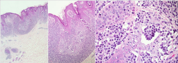 Figure 2 Intense monomorphonuclear infiltrate in a band at the dermal-epidermal junction, with atypical lymphocytes that lit up the epidermis, isolated and in clusters.