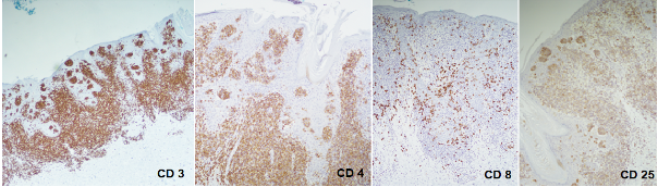 Figure 3 Positive CD4 in practically all lymphocytes of the dermis and epidermis and positive CD25 in all atypical lymphocytes.