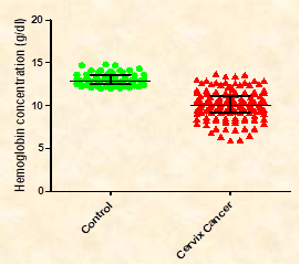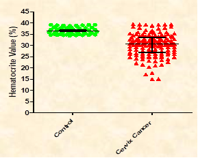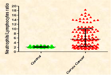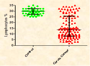 Results: The results showed that the mean age of the cervix cancer patients was 53.37±11.6 years. RBCs count, hemoglobin concentration, Hct value, MCH, MCHC, and lymphocytes % were significantly (P<0.01) decreased compared with the healthy individuals. On the other hand, leukocytes and platelets count, mixed %, neutrophils %, PLTs/Lymph, and Neutrophils/Lymphocytes ratios were significantly increased as compared with the healthy individuals.