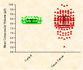 The mean age of the cervix cancer patients included in the current study was 53.37±11.6 years (26–88 years). The results in Table 1 & Figures 1–3,5,6 show that patients with cervix cancer had a significant (P< 0.01) decrease in the median (IQR) of RBCs count [(x 106/μL), 3.74 (3.33-4.17)], hemoglobin concentration [(10.05 (9.225-11.18) g/dl], Hct value [30.80(26.83-33.40)], MCH [27.90(25.83-29.40) Pg], and MCHC [33.00(31.50-34.33) g/dl] compared with the healthy individuals (median (IQR) 4.11 (3.90-4.29), 12.90(12.50-13.60), 36.30(35.25 -37.88), 29.00(28.05-30.00), 34.70(34.00-35.43), respectively. Data in Table 1 & Figure 4 show a none significant (P>0.05) change in median (IQR) of mean corpuscular volume (MCV) in cervix cancer patients [83.65(77.70-87.30) μ3] compared with the healthy individuals [83.00(81.00-84.15) μ3].