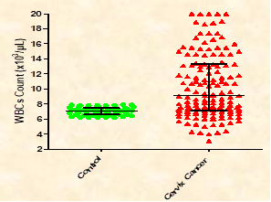 Progesterone is considered to be a stimulator of HPV gene expression. Multiple sexual partners, those who have children from a young age, and sexual behavior, vitamin A, and C deficiency, and smoking are also considered as risk factors.12,13 Blood act as a pathological reflector of the status of exposed patient to infections and other conditions. Laboratory tests on the blood are vital tools that help detect any deviation from normal in the human body.14As the disease progresses, changes appear in haematological parameters such as WBCs, RBCs, haemoglobin which have been of relevant consideration in context of cancer patients.15 Cervical cancer has direct impact on the haematological parameters.16 Leukocytosis has been evaluated in many studies in lung cancers and colorectal cancer.17,18 The association between leukocytosis and the stage of cervical cancer was demonstrated in another study.19