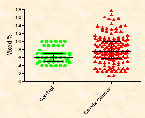 The results in Table 2 and Figures 7–12 show that patients with cervical cancer had a significant (P<0.01) increase in the median (IQR) of leukocytes count (x 103/μL) [9.07(7.08-13.30)], Mixed [,7.40(5-10)], neutrophils % [78.80(64.83-84.40)], Platelets Count (x103/μL) [268.0(200-368)], PLTs/Lymph ratio [202.3(140-346.2)], and Neutrophils/Lymphocytes ratio [5.510(2.43-10.10)], respectively compared with the healthy individuals median (IQR), 7.1 (6.6-7.475), 6 (5-7), 63 (62-66.75), 214 (201-291.8), 108 (97.10-140.7) and 2.1(1.9-2.475), respectively. Conversely, the median (IQR) of lymphocytes % in cervix cancer patients was significantly (P< 0.0001) decreased 13.75(8.125-25.60 when compared with the healthy individuals 30.00(27.13-32) (Table 2 & Figure 13).