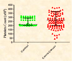 The current study showed that a significant increased in the median of platelets count in cervix cancer patient as compared with the controls. This result is similar to the result of Okwesili et al.,14 who observed that the mean platelet count in the cervical cancer patients was increased compared to normal controls. Also, Wang et al., 2017 recorded that platelets count was significantly increased in cervical cancer patients compared with the controls. The platelet count is an additional marker of systemic inflammation which is precipitated by the tumor formation. Proinflammatory cytokines such as IL-1 and IL-6 leads to megakaryocyte proliferation and thrombocytosis.44,45 Thrombocytosis may be seen in cancer patients as a result of cancer induced anaemia. A negative feedback effect on erythropoietic production in cases as a result of the anaemia could be for responsible for the thrombocytosis. Erythropoietin has a structural homology with thrombopoietin, although the latter is considerably larger than the former but roughly half of thrombopoietin at the N- terminal region.46