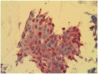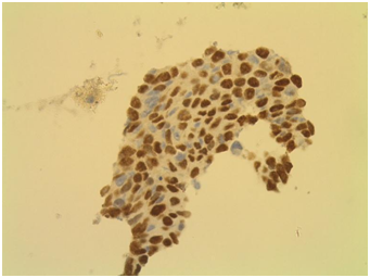 His laboratory workup did not show any abnormality. Imaging studies including a Neck CT scan demonstrated enhancing lobulated lesion along the right tonsillar/peritonsillar region extending up to the nasopharynx measuring 6x4 cm, associated with mild displacement of the internal carotid artery and internal jugular vein postero laterally. The lesion wraps near circumferentially around these vessels. In addition to mildly enlarged right level two lymph nodes, with the largest measuring 2cm. Ultrasound guided biopsy of the occipital neck LN was arranged, the pathology result identified metastatic squamous nasopharyngeal carcinoma. Immunohistochemical analysis and in situ hybridization of the occipital lymph node further confirmed the presence of EBV Encoded RNAs (EBERs) indicating EBERs expression in tumor cells, as well as positivity for CK 5/6 and P40, as demonstrated in (Figure 1).