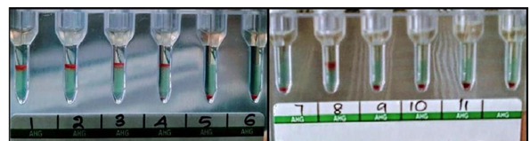 Blood group of mother was confirmed as B-Rh-(D) negative. IAT was positive with a titre of 32 and there was enhanced reaction at enzymatic phase. Antibody screening and identification panels showed pattern of reactivity corresponding to “anti-D”, “anti- C” and “anti-E” (Figures 2A&2B) . In order to rule out anti-G, maternal serum was adsorbed onto R2R2 (D+C-) cells. Eluate from these cells were tested for reactivity against r’r (D-+) cells and was found to be negative. Hence, anti-G was ruled out.