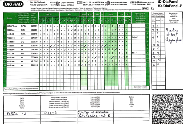 Maternal Rh extended phenotype was D-C-E-c+e+. Blood group of both father and first child was B Rh-(D) positive with extended Rh phenotype D+C+E+c+e+ and D+C+E-c+e+ respectively.