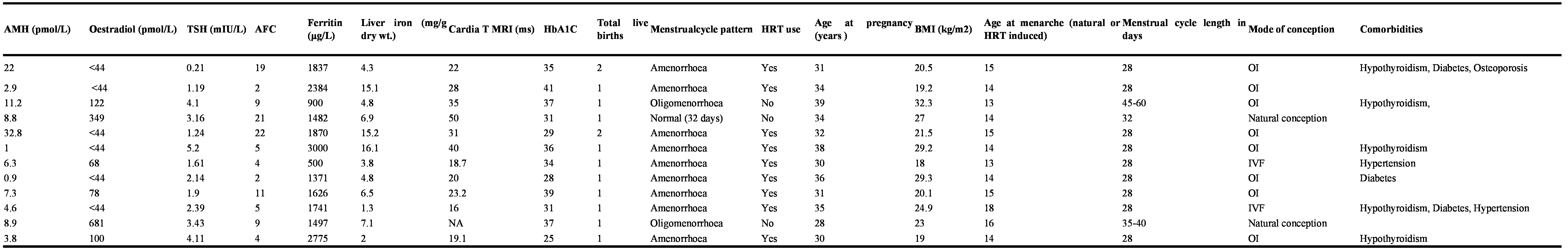 Study design: This is a retrospective study in which we collected data from 12 women with transfusion-dependent BTM and at least one successful live birth from our thalassaemia clinic between July 2007 to June 2022. Patient demographics, medical history, menstrual history, hormonal parameters (serum levels of FSH, oestradiol, TSH and AMH) and antral follicle count were recorded. Serum levels of ferritin, cardiac T2*, liver iron concentration and thyroid function results were recorded from clinic visit prior to either natural conception or assisted conception treatments.