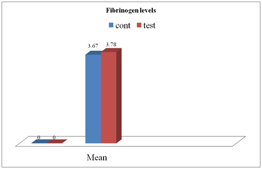 Fibrinogen also performed for same groups, but no significant differences found between the two groups by using Independent Samples Test in SPSS program ver. 22 Figure 2 (mean 3.66±0.94 for test and 3.78±0.72g/l for control) Table 4 P<0.58 Table 5