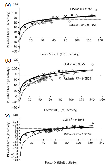 Figures 1 and 2 show the nonlinear regression lines obtained from PT measured with RB and HR, respectively, against extrinsic pathway factor levels: FV (Figure 1a & 2a), FVII (Figure 1b & 2b) and FX (Figure 1c & 2c). Lines obtained by mixtures prepared according to CLSI guidelines and patient’s plasmas are shown. Factor activities present in patient’s plasmas were 20-140 IU/dL for FV, 10-148 IU/dL for FVII and 30-138 IU/dL for FX.