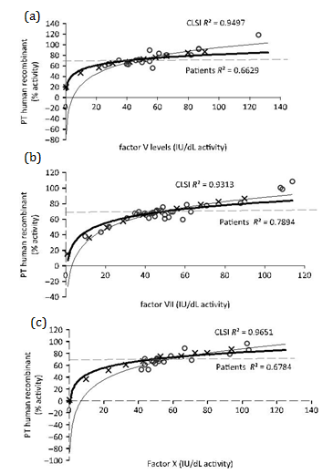 The sensitivity of reagent instrument combinations can be determined by each laboratory using plasmas from deficient patient’s2 or with mixtures of pooled normal and specific factor deficient plasmas, as it was done for APTT in some studies some time ago,3 but plasmas from patient’s with single factor deficiencies can be difficult to achieve due to the low prevalence of some deficiencies.
