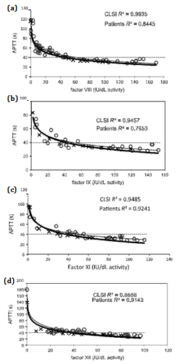 The Clinical and Laboratory Standards Institute (CLSI) H47A2 guideline4 proposes that the sensitivity of APTT should be studied by performing the APTT on different mixtures of commercial normal pooled plasma and deficient plasmas. It could potentially be performed in any hemostasis laboratory of median low complexity. However, more recently, it has been shown that, although this guideline is feasible,5 different results were obtained when using different deficient plasmas source, lyophilized or frozen, or lyophilized from different manufacturers.6 The objective of this study was to calculate the sensitivity of the PT and APTT, used in our laboratory, to various factor levels by following the guideline procedure and to compare the results with those obtained using plasmas from patients with a single factor deficiency.
