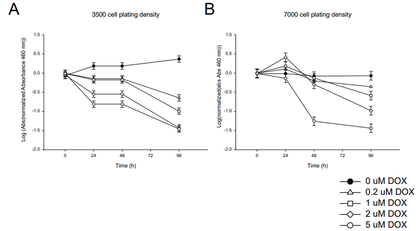An experimental schema is shown in Figure 1. Cell proliferation and viability were quantified using a WST- 1 assay (Sigma Aldrich, Catalog No. 5015944001) per manufacturer’s instructions. As shown in the experimental chematic (Figure 1), cells were plated at densities of 3500 and 7000 cells/well of four wells on a 96 well plate/dose/treatment (USA Scientific, Catalog No.CC7682-7596) (e.g., technical quadruplicates), at time point designated as -24 hours. After incubation at 37°C, 5% CO2, in HSA medium for 24 hours, the media was removed and replaced with a treatment or control media, this is designated time 0. Treatment groups included 1%, 5%, and 10% v/v LHP-containing media, either unloaded- or DOX- loaded. Standard HSA cell culture media and media containing free DOX at 4 different concentrations (0.2, 1, 2, and 5 μM) served as the negative and positive controls, respectively. At 24 hours, the treatment or control medium was removed by gentle aspiration, the plates were washed once with HSA medium, then replenished with fresh medium. Plates were analyzed by WST-1 assay at time points 0, 24 hours, 48 hours, and 96 hours according to the manufacturer’s instructions. Briefly, plates were incubated with WST-1 reagent for 2 hours and absorbance was read at 460 nm using a SpectraMax i3X plate reader. The absorbance readings were compared between unloaded- and DOX-loaded LHP products and analyzed by analysis of variance (ANOVA) with factors being treatment, dose, and time. The absorbance readings for different DOX concentrations were analyzed by ANOVA with the factors being dose and time.