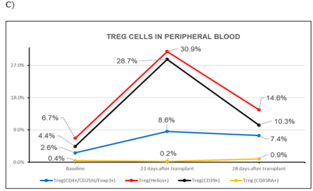 A) Identification and enumeration of stem cells in peripheral blood and the product of the two apheresis, performed on the patient during transplantation process. Cellular viability was included in the obtained product. Cellular values in the bag refer to dilution 1:10. ISHAGE recommendations were followed for absolute count by single platform. B) Quantification of lymphocyte subpopulations before and after transplantation. C) Immunophenotype of T regulatory cells (Treg) before and after transplantation. Tregs, detected as percentage of all lymphocytes and the rest of Treg subpopulations as percentages of Th lymphocytes.