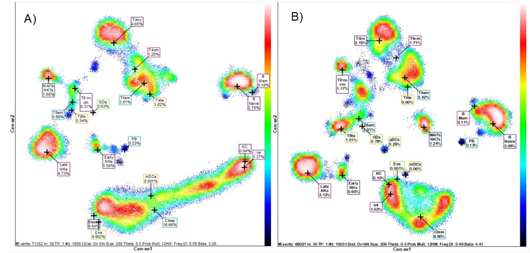 Mass cytometry made possible to show in which specific leukocyte subpopulations, lie the changes found in the different measurements, since this technology allows the analysis of several subphenotypes of each major population (T, B and NK). Using a detailed immunophenotype can improve the prognostic and predictive value of the evaluation of the immune system, both in the evaluation of post-transplant immune reconstitution and in the evolution and outcomes of the underlying disease. This can only be done by multiparametric methods with high-dimensional single cell analysis, in which mass cytometry is a valued technology (Figure 2).