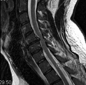 MRI T2 Axial demonstrating homogeneous hyperintense signal changes of the dorsal columns and the corticospinal tract due to vitamin B12 deficiency.