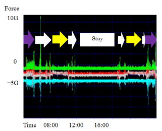 The LD level is the most sensitive indicator of the RBC degradation of RBCs. The samples were taken from the RBC solutions on the one day before the test and one day later. Each sample was evaluated on an average of four sampling sessions. We calculated the rate of change in the LD level (LD ratio) with respect to the LD level before the test. The mean±standard deviation of the LD ratios for RBC#1 before the test was were 1.1±0.1-fold and 1.0±0.1 (mean±standard deviation) for RBC #1 (for the flight and non-flight groups, respectively) and 1.0±0.1-fold for RBC #1 (non-flight group). The LD ratios for RBC#1in the blood bags of the flight group after the airplane transport were 0.9±0.0-fold and 1.2±0.2-fold for the flight and of that of the non-flight groups, respectively. Similar calculations were performed for the other samples (RBC #2, #3, and #4); however, most of the results were not significantly different. Only in RBC #3 in the non-flight group had a higher, the LD ratio after filtering was higher in the blood left in the laboratory. This was thought to be due to the fact that the blood was not affected by transport (Table 1). All statical calculation performed using Excel version 2009. Data are expressed as mean ± standard deviation. The level of significance 5%. There were no visible changes in the blood bags. In terms of vibration, the wobble was smaller in flight than compared to that in an accelerating automobile or whilethe acceleration during automobile (car) transport and walking (Figure 1). Hence, we could infer that the air transportation of blood for transfusion by flight may not reduce its quality.