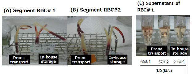 (B) Gross findings of segment tubes in the RBC#2 transported by drone (right) and in-house storage (left)