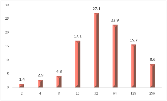 A total of 70 samples from group O APs donors were tested for anti-A and anti-B antibody titers. The donors were 20 to 58 years old (mean age: 39.8±1.1). Men were prevalent (60/70-85.7%) in the donor population, females were the minority (10/70-14.3%). The screening test for unexpected blood group antibodies was negative for all samples. Anti-A titers ranged from 2 to 1024 (mean titer: 64), Anti-B titers ranged from 2 to 256 (mean titer: 32). Anti-A titers were significantly higher than anti-B (p<0.01). Based on what is most commonly cited5,17-24 the critical value for “high-titer” anti-A/B antibodies, for our method (direct agglutinin (IgM) by gel), was defined to be at least 64. The prevalence of group O APs donors with “high-titer” anti-A and anti-B, in our study is relatively high, 55.8% and 47.2% respectively. Table 1 shows the results of anti-A and anti-B titers by direct agglutination (IgM) using the manual gel method. The above results are also demonstrated in Figure 1 and Figure 2 as the relative percentage in the form of histograms. There was no significant difference between donors when they were divided into two age groups: over and under 40 years (p>0.857 and p>0.861), (Table 1 & Figure 1 & 2).